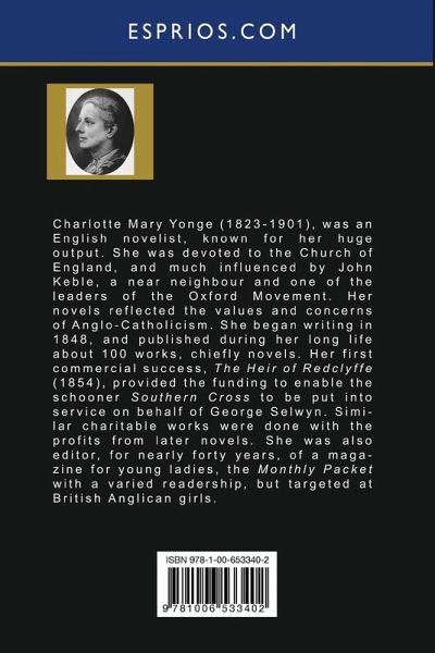 Charlotte Mary Yonge (1823-1901), was an English novelist, known for her huge output. She was devoted to the Church of England, and much influenced by John Keble, a near neighbour and one of the leaders of the Oxford Movement. Her novels reflected the values and concerns of Anglo-Catholicism. She began writing in 1848, and published during her long life about 100 works, chiefly novels. Her first commercial success, The Heir of Redclyffe (1854), provided the funding to enable the schooner Southern Cross to be put into service on behalf of George Selwyn. Similar charitable works were done with…mehr