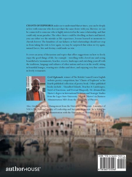 Chants of Euphoria makes us to understand that at times, you can be deeply in love with someone who does not share the same desire with you, likewise, we can be connected to someone who is highly interested in the same relationship, and that could only mean paradise. The other choice could be dwelling on hurts and hatred, you can either see the mistake as life experience, lessons learned or moments to cherish forever. The banalities of our failures or bad relationships should not stop us from taking the risk to love again, we may be surprised that when we try again, natural forces, fate and destiny could make us win. It covers an array of discussions and topics that offers suggestions on how to freely enjoy the good things of life, for example - travelling with a loved one and seeing beautiful arts/monuments, beaches, resorts, landscapes and enriching yourself with the traditions, language and cultures of other nations and races in the world, sitting in beautiful lounges, wearing nice clothes and shoes, and enjoying very fine cuisines in lovely restaurants.