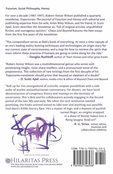 For over a decade (1987-1997), Robert Anton Wilson published a quarterly newsletter, Trajectories: The Journal of Futurism and Heresy with editorial and publishing expertise from his wife, Arlen Riley Wilson, and his friend, D. Scott Apel. Scott describes the newsletter as, "full of original articles, unpublished fiction, and outrageous opinion." Chaos and Beyond features the best essays from the first five years of the newsletter. Mostly written by Robert Anton Wilson. Guest appearances by Arlen Wilson, D. Scott Apel, Barbara Marx Hubbard, Timothy Leary, Ph.D. Linus Pauling, Ph.D., Robert Newport, M.D., Edward Kellogg III, Ph.D., Peter Russell, George Carlin, and Ed McMahon. "This compendium serves as Bob's book of everything. At once a time capsule of an era's leading reality-busting techniques and technologies, an origin story for our current state of consciousness, and a map for how to retrieve the spirit that must inform these practices if humans are going to come along for the ride." - Douglas Rushkoff, author of Team Human and other great books "Robert Anton Wilson was a multidimensional genius who wrote with penetrating insight, razor-sharp intellect, and a pronounced sense of the preposterous. This collection of rare writings from the first decuple of his Trajectories newsletter should prove that beyond an elephant of a doubt!" - D. Scott Apel, author, media critic & editor of Beyond Chaos and Beyond "Roll up for this smorgasbord of scientific utopian possibilities with a side order of acerbic antiauthoritarian commentary. For dessert, we have lucid deconstruction of conspiracy theory and musings on the necessity of uncertainty. This is Bob and his collaborators actively engaging in the fecund period of the late '80s and early '90s when the tech revolution seemed promising, the freaks seemed poised to take over and anything was possible. And there's RAWs literary flare. He's a master of logic and a maestro of puckish surreal illogic, an enigma wrapped in a sheet of blotter baked into a flying lasagna. Read on!" - R. U. Sirius, writer, editor, musician and cyberculture celebrity