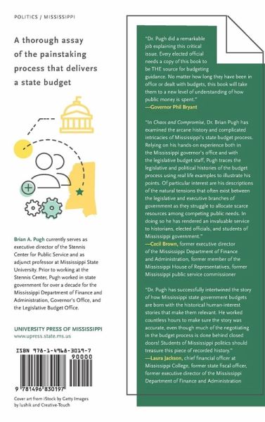 Chaos and Compromise: The Evolution of the Mississippi Budgeting Process takes the topic of budgeting and makes it exciting, and not just for political junkies. Instead of focusing on numbers, this book looks at the policymakers responsible for the budget. Brian A. Pugh provides a historical perspective on the decisions and actions of legislators and governors going back more than a century. Pugh reviews how Mississippi's budget making evolved and sifts legislation and litigation as well as those legislators and governors responsible for developing this process. Pugh explains in detail the significant actions taken by the legislative, judicial, and executive branches of government that affected Mississippi's procedures. Significant legislation covered includes the passage of Senate Bill 356, which gave the governor the authority to prepare and submit a budget recommendation in 1918; the passage of the Administrative Reorganization Act of 1984; the passage of the Budget Reform Act of 1992; and the passage of the Financial and Operational Responses That Invigorate Future Years Act (FORTIFY) during the First Extraordinary Session of 2017. The first two chapters provide a historical perspective and give the reader an understanding of how legislation and litigation contributed. The book also covers interventions by the courts, which led to the unprecedented separation of powers case Alexander v. State of Mississippi by and Through Allain (1983). In addition to discussing important laws and legislators, Pugh takes a detailed look at six of Mississippi's recent governors--Bill Allain, Ray Mabus, Kirk Fordice, Ronnie Musgrove, Haley Barbour, and Phil Bryant--to examine their methods for getting the legislature to include their ideas in the often anguished process of making a budget.