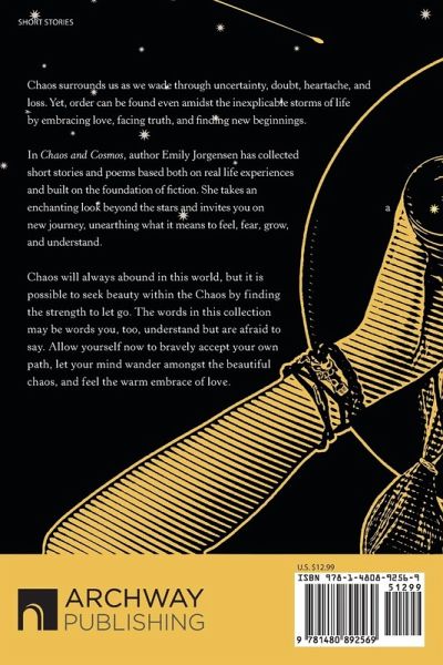 Chaos surrounds us as we wade through uncertainty, doubt, heartache, and loss. Yet, order can be found even amidst the inexplicable storms of life by embracing love, facing truth, and finding new beginnings. In Chaos and Cosmos, author Emily Jorgensen has collected short stories and poems based both on real life experiences and built on the foundation of fiction. She takes an enchanting look beyond the stars and invites you on a new journey, unearthing what it means to feel, fear, grow, and understand. Chaos will always abound in this world, but it is possible to seek beauty within the Chaos by finding the strength to let go. The words in this collection may be words you, too, understand but are afraid to say. Allow yourself now to bravely accept your own path, let your mind wander amongst the beautiful chaos, and feel the warm embrace of love.