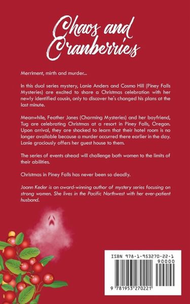 Merriment, Mirth and Murder. In this dual series mystery, Lanie Anders and Cosmo Hill (Piney Falls Mysteries) are excited to share a Christmas celebration with her newly identified cousin. His last-minute cancellation leaves the Anders-Hill couple with an empty guest house and a lot of questions. Meanwhile, Feather Jones (Charming Mysteries) and her boyfriend, Tug are in Piney Falls, Oregon to celebrate the holiday, their first away from Charming as a couple. Upon arrival, they are shocked to learn of a crime committed in the very room they are scheduled to stay. Now they face the unhappy prospect of spending Christmas on the road. Lanie graciously offers her guest house to them for the week, setting off a series of events that will test the capabilities of both women. Ghosts, murders and one very shocking disappearance-just another holiday in Piney Falls. Don't miss this exciting crossover holiday mystery from USA TODAY bestselling author, Joann Keder!
