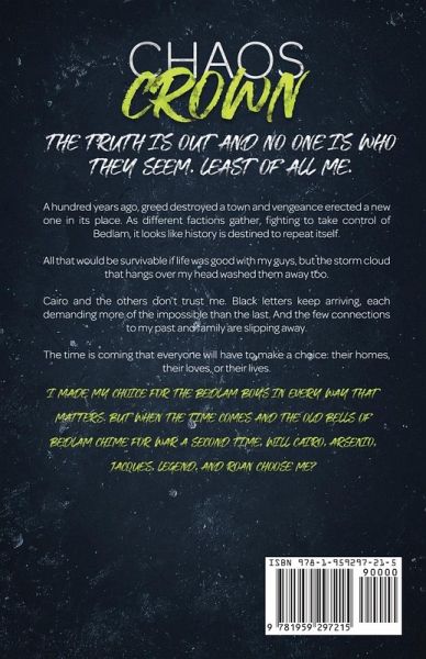 The truth is out and no one is who they seem. Least of all me. A hundred years ago, greed destroyed a town and vengeance erected a new one in its place. As different factions gather, fighting to take control of Bedlam, it looks like history is destined to repeat itself. All that would be survivable if life was good with my guys, but the storm cloud that hangs over my head washed them away too. Cairo and the others don't trust me. Black letters keep arriving, each demanding more of the impossible than the last. And the few connections to my past and family are slipping away. The time is coming that everyone will have to make a choice: their homes, their loves, or their lives. I made my choice for the Bedlam Boys in every way that matters. But when the time comes and the old bells of Bedlam chime for war a second time, will Cairo, Arsenio, Jacques, Legend, and Roan choose me?