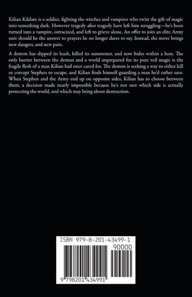 Kilian Kildare is a soldier, fighting the witches and vampires who twist the gift of magic into something dark. However tragedy after tragedy have left him struggling—he's been turned into a vampire, ostracized, and left to grieve alone. An offer to join an elite Army unit should be the answer to prayers he no longer dares to say. Instead, the move brings new dangers, and new pain. A demon has slipped its leash, killed its summoner, and now hides within a host. The only barrier between the demon and a world unprepared for its pure veil magic is the fragile flesh of a man Kilian had once cared for. The demon is seeking a way to either kill or corrupt Stephen to escape, and Kilian finds himself guarding a man he'd rather save. When Stephen and the Army end up on opposite sides, Kilian has to choose between them, a decision made nearly impossible because he's not sure which side is actually protecting the world, and which may bring about destruction.