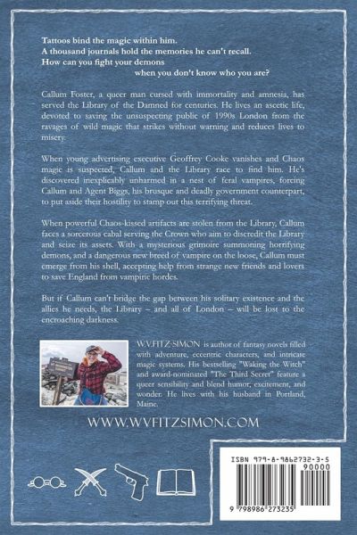 Tattoos bind the magic within him. Journals hold the memories he can't recall. How can you fight your demons when you don't know who you are? Callum Foster, a queer man cursed with immortality and amnesia, has served the Library of the Damned for centuries. He lives an ascetic life, devoted to saving the unsuspecting public of 1990s London from the ravages of wild magic that strikes without warning and reduces lives to misery. When young advertising executive Geoffrey Cooke vanishes and Chaos magic is suspected, Callum and the Library race to find him. He's discovered inexplicably unharmed in a nest of feral vampires, forcing Callum and Agent Biggs, Callum's brusque and deadly government counterpart, to put aside their hostility to stamp out this terrifying threat. When powerful Chaos-kissed artifacts are stolen from the Library, Callum faces a sorcerous cabal serving the Crown who aim to discredit the Library and seize its assets. With a mysterious grimoire summoning horrifying demons, and a dangerous new breed of vampire on the loose, Callum must emerge from his shell, accepting help from strange new friends and lovers to save England from vampiric hordes. But if Callum can't bridge the gap between his solitary existence and the allies he needs, the Library - and all of London - will be lost to the encroaching darkness.
