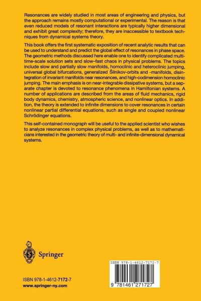 Resonances are ubiquitous in dynamical systems with many degrees of freedom. They have the basic effect of introducing slow-fast behavior in an evolutionary system which, coupled with instabilities, can result in highly irregular behavior. This book gives a unified treatment of resonant problems with special emphasis on the recently discovered phenomenon of homoclinic jumping. After a survey of the necessary background, a general finite dimensional theory of homoclinic jumping is developed and illustrated with examples. The main mechanism of chaos near resonances is discussed in both the dissipative and the Hamiltonian context. Previously unpublished new results on universal homoclinic bifurcations near resonances, as well as on multi-pulse Silnikov manifolds are described. The results are applied to a variety of different problems, which include applications from beam oscillations, surface wave dynamics, nonlinear optics, atmospheric science and fluid mechanics. The theory is further used to study resonances in Hamiltonian systems with applications to molecular dynamics and rigid body motion. The final chapter contains an infinite dimensional extension of the finite dimensional theory, with application to the perturbed nonlinear Schrödinger equation and coupled NLS equations.
