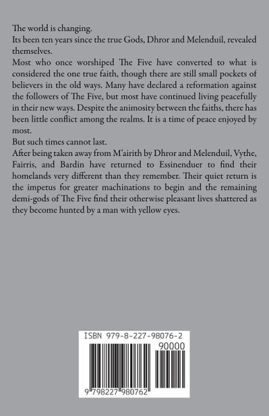 The world is changing. Its been ten years since the true Gods, Dhror and Melenduil, revealed themselves. Most who once worshiped The Five have converted to what is considered the one true faith, though there are still small pockets of believers in the old ways. Many have declared a reformation against the followers of The Five, but most have continued living peacefully in their new ways. Despite the animosity between the faiths, there has been little conflict among the realms. It is a time of peace enjoyed by most. But such times cannot last. After being taken away from M'airith by Dhror and Melenduil, Vythe, Fairris, and Bardin have returned to Essinenduer to find their homelands very different than they remember. Their quiet return is the impetus for greater machinations to begin and the remaining demi-gods of The Five find their otherwise pleasant lives shattered as they become hunted by a man with yellow eyes.