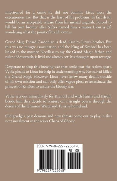 Imprisoned for a crime he did not commit Lieut faces the executioners axe. But that is the least of his problems. In fact death would be an acceptable release from his mental anguish. Forced to kill his own brother after Ne'tra named him a traitor Lieut is left wondering what the point of his life even is. Grand Magi Fenard Cardonian is dead, slain by Lieut's brother. But this was no meagre assassination and the King of Krn¿rel has been linked to the murder. Needless to say the Grand Magi's father, and ruler of Sesserrech, is livid and already sets his thoughts upon revenge. Desperate to stop this brewing war that could tear the realms apart, Vythe pleads to Lieut for help in understanding why Ne'tra had killed the Grand Magi. However, Lieut never knew many details outside of his own mission and can only offer vague plots to assassinate the princess of Krn¿rel to ensure the bloody war. Vythe sets out immediately for Krenorl and with Fairris and B¿rdin beside him they decide to venture on a straight course through the deserts of the Crimson Wasteland, Fairris's homeland. Old grudges, past demons and new threats come out to play in this next instalment in the series Chaos of Choice.
