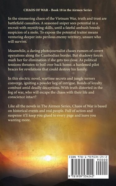 In the simmering chaos of the Vietnam War, truth and trust are battlefield casualties. A seasoned sniper sees potential in a recruit with mystifying skills, until a fateful ambush breeds suspicion of a mole. To expose the potential traitor means venturing deeper into perilous enemy territory, unsure who will survive. Meanwhile, a daring photojournalist chases rumors of covert operations along the Cambodian border. But shadowy forces mark her for elimination if she gets too close. As political tensions threaten to boil over back home, a hardened pilot braces for revelations that could destroy his family. In this electric novel, wartime secrets and jungle terrors converge, igniting a powder keg of intrigue. Bonds of loyalty combust amid deadly deceptions. With truth distorted in the fog of war, who will escape the chaos with their life and conscience intact? Like all the novels in The Airmen Series, Chaos of War is based on historical events and real people. Full of action and suspense it'll keep you glued to every page and leave you wanting more.