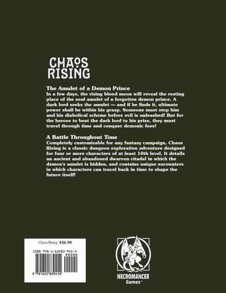 The Amulet of a Demon Prince In a few days, the rising blood moon will reveal the resting place of the soul amulet of a forgotten demon prince. A dark lord seeks the amulet - and if he finds it, ultimate power shall be within his grasp. Someone must stop him and his diabolical scheme before evil is unleashed! But for the heroes to beat the dark lord to his prize, they must travel through time and conquer demonic foes! A Battle Throughout Time Completely customizable for any fantasy campaign, Chaos Rising is a classic dungeon exploration adventure designed for four or more characters of at least 10th level. It details an ancient and abandoned dwarven citadel in which them demon's amulet is hidden, and contains unique encounters in which characters can travel back in time to shape the future itself!`