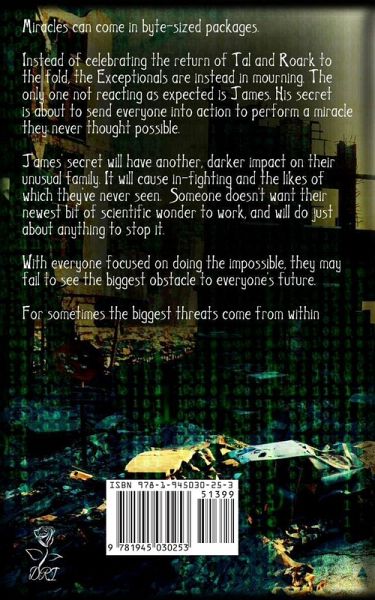 Miracles can come in byte-sized packages. Instead of celebrating the return of Tal and Roark to the fold, the Exceptionals are instead in mourning. The only one not reacting as expected is James. His secret is about to send everyone into action to perform a miracle they never thought possible. James' secret will have another, darker impact on their unusual family. It will cause in-fighting and the likes of which they've never seen. Someone doesn't want their newest bit of scientific wonder to work and will do just about anything to stop it. With everyone focused on doing the impossible, they may fail to see the biggest obstacle to everyone's future For sometimes the biggest threats come from within.