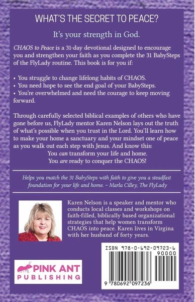 You don't have to be overwhelmed at the state of your house anymore, because help is here! CHAOS to Peace is a 31-day devotional designed to encourage you and strengthen your faith as you complete the 31 BabySteps of the FlyLady housekeeping routine. Includes a foreword by FlyLady, Marla Cilley. This book is for you if you struggle to change lifelong habits of CHAOS, you need hope to see the end goal of your BabySteps, or you’re overwhelmed and need the courage to keep moving forward. The secret to peace in the midst of CHAOS (can't have anyone over syndrome) is your strength in God. Through carefully selected biblical examples of others who have gone before us, FlyLady mentor Karen Nelson lays out the truth of what’s possible when you trust in the Lord. You’ll learn how to make your home a sanctuary and your mindset one of peace as you walk out each step with Jesus. Buoyed by the compassion and understanding in these pages, you’ll feel refreshed and encouraged each day. And know this: You CAN transform your life and home. You ARE ready to conquer the CHAOS! "Stepping in faith each day gives us the strength to overcome the CHAOS in our lives. Karen has taken the FlyLady System and paired it with the biblical teachings to give you a steadfast foundation for your life and home. May God continue to bless her!" ~ Marla Cilley, the FlyLady, www.flylady.com, author of Sink Reflections and CHAOS to Clean