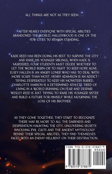 All things are not as they seem . . . After nearly everyone with special abilities abandoned the world, Hallenwood is one of the few cities to remain standing. Kade Reed has been doing his best to survive the city and raise his younger siblings. When Kade is murdered, four students must decide whether to let the world burn or to fight to keep hope alive. Elsey Hallen is an angry loner who has to deal with more scars than most. Henry Adamson is an addict trying desperately to keep his monsters buried. Charlotte Marion is a determined athlete tired of living in a world running on fear and despair. Wesley Reed is just trying to raise his younger sister and build a future for himself while mourning the loss of his brother. As they come together, they start to recognize there may be more to all the darkness and desperation haunting the city. Uncovering secrets involving evil cults and the ancient mythology behind their special abilities, they find themselves faced with an enemy hellbent on their destruction. Note: Check the author's website for content warnings.