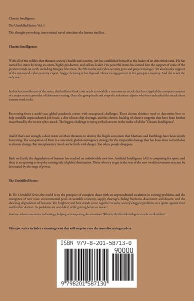 Chaotic Intelligence The Unriddled Series: Vol. 1 Pages: 244 This thought-provoking, innovational novel stimulates the human intellect. Chaotic Intelligence: With all of the riddles that threaten society's health and security, Art has established himself as the leader of an elite think tank. He has earned his status by being an astute, highly productive, and callous leader. His powerful status has earned him the support of some of the greatest minds on earth, including Morgan Silverman, the FBI media and cyber-security guru and project manager. Art also has the support of the renowned, cyber-security expert, Auggie Lenning at his disposal. Desiree's engagement in the group is a mystery. And she is not the only one. In this first installment of the series, this brilliant think tank needs to unriddle a ransomware attack that has crippled the computer systems of a major service provider of laboratory testing. Once the group finds and stops the nefarious culprits who have unleashed the attack there is more work to do. Recovering from a multi-year, global pandemic comes with unexpected challenges. These chosen thinkers need to determine how to help unriddle unprecedented job losses, a dire silicon chip shortage, and the chronic backlog of elective surgeries that have been further exacerbated by the recent cyber-attack. The biggest challenge is trying to find answers in the midst of all the "Chaotic Intelligence". And if that's not enough, a dust storm on Mars threatens to destroy the fragile ecosystem that Martians and Earthlings have been jointly harvesting. The occupation of Mars is a concerted, global contingency strategy for the irreparable damage that has been done to Earth due to climate change. But interplanetary travel can be froth with danger. Too often, people disappear. Back on Earth, the degradation of humans has reached an unbelievable new low. Artificial Intelligence (AI) is competing for sport, and there is an uprising to stop the coming tide of global domination. Those who try to get in the way of the new world movement may just be devastated by the surge of power. The Unriddled Series: As the world evolves, governance is also changing. The most significant developments have been in a decentralized, distributed way, which allows for much more creativity, originality, and contribution. Today we have crowdsourced funding, social networking, and forums to discuss issues online. We have worldwide communication tools like Twitter and Meta. With the introduction of the internet, and especially with the Internet of Things, we have a huge amount of data and information available at our fingertips, which we can then use for decision making. The downside of all this is that it is not easy to actually know which sources we can trust. The question of who is responsible if something goes wrong is also much harder today, and more difficult to evaluate than before. In The Unriddled Series, the world is on the precipice of complete chaos with an unprecedented escalation in existing problems, and the emergence of new ones: environmental peril, an unstable economy, supply shortages, fading freedoms, discontent, and dissent, and the shocking degradation of humans. The brightest and best minds come together to solve society's biggest problems in a sprint against time and further decline. As problems are unriddled, is life getting better or worse? And are advancements in technology helping or hampering the situation? What is Artificial Intelligence's role in all of this? This epic series includes a stunning twist that will surprise even the most discerning readers.