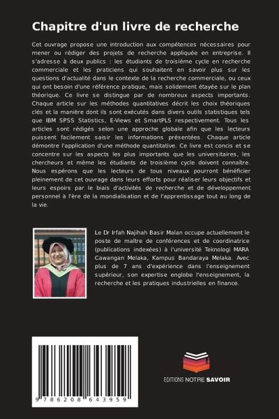 Cet ouvrage propose une introduction aux compétences nécessaires pour mener ou rédiger des projets de recherche appliquée en entreprise. Il s'adresse à deux publics : les étudiants de troisième cycle en recherche commerciale et les praticiens qui souhaitent en savoir plus sur les questions d'actualité dans le contexte de la recherche commerciale, ou ceux qui ont besoin d'une référence pratique, mais solidement étayée sur le plan théorique. Ce livre se distingue par de nombreux aspects importants. Chaque article sur les méthodes quantitatives décrit les choix théoriques clés et la manière dont ils sont exécutés dans divers outils statistiques tels que IBM SPSS Statistics, E-Views et SmartPLS respectivement. Tous les articles sont rédigés selon une approche globale afin que les lecteurs puissent facilement saisir les informations présentées. Chaque article démontre l'application d'une méthode quantitative. Ce livre est concis et se concentre sur les aspects les plus importants que les universitaires, les chercheurs et même les étudiants de troisième cycle doivent connaître. Nous espérons que les lecteurs de tous niveaux pourront bénéficier pleinement de cet ouvrage dans leurs efforts pour réaliser leurs objectifs et leurs espoirs par le biais d'activités de recherche et de développement personnel à l'ère de la mondialisation et de l'apprentissage tout au long de la vie.