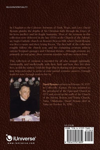 In Chaplain to the Caboose: Sermons of Faith, Hope, and Love, David Bynum plumbs the depths of his Christian faith through the lenses of his keen intellect and his fragile humanity. Most of the sermons in this collection were delivered in the late 1970s at the Church of the Advent, an Anglo-Catholic church on Boston’s Beacon Hill, where David Bynum was first a curate and then Acting Rector. The first half of the collection roughly follows the church year, and the remaining sermons address various Scripture passages and Christian themes. Although sermons are primarily an oral genre, these sermons translate well into written form. This collection of sermons is intended for all who struggle spiritually, emotionally, and intellectually with their faith and how they live their lives, as did the author, "with the hope that in sharing our perceptions, we may help each other to arrive at some partial, tentative answers. Enough truth for now. Enough truth to live by."