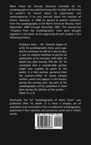 Mark Twain (or Samuel Clemens) intended for his autobiography to be published long after he died. He felt that he couldn't be honest about his experiences and contemporaries if he was worried about the reaction of others. However, in 1906 he agreed to publish selections from the autobiography in the North American Review, from September 1906 through December 1907. The twenty-five "Chapters from My Autobiography" have been brought together in this book. At the beginning of each chapter is the following preface: Prefatory Note -- Mr. Clemens began to write his autobiography many years ago, and he continues to add to it day by day. It was his original intention to permit no publication of his memoirs until after his death; but, after leaving "Pier No. 70," he concluded that a considerable portion might now suitably be given to the public. It is that portion, garnered from the quarter-million of words already written, which will appear in this Review during the coming year. No part of the autobiography will be published in book form during the lifetime of the author. -- Editor N. A. R. Eventually the full 'Autobiography of Mark Twain' was published after his death. It is more a lengthy set of anecdotes and ruminations than a traditional autobiography, published in four volumes and comprises some half a million words.