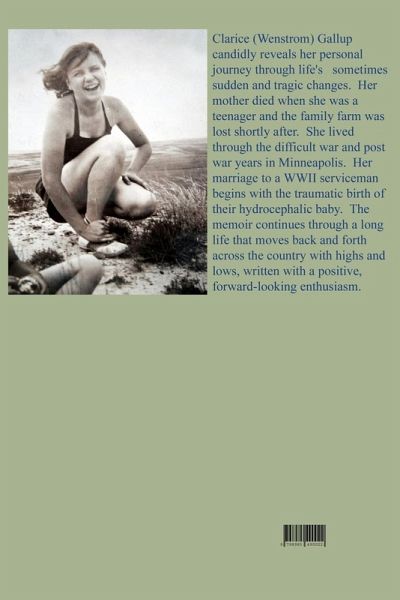 Clarice Gallup candidly reveals her personal journey through life's sometimes sudden and tragic changes. Her mother died when she was a teenager and the family farm was lost shortly after. She lived through the difficult war and post war years in Minneapolis. Her marriage to a WWII serviceman begins with the traumatic birth of their hydrocephalic baby. The memoir continues through a long life that moves back and forth across the country with highs and lows, written with a positive, forward-looking enthusiasm.