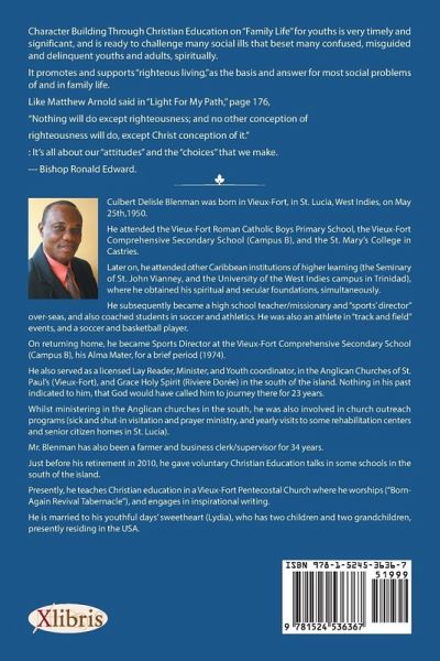 "Character Building through Christian Education on ‘Family Life’ for youths is very timely and significant and is ready to challenge many social ills that beset many confused, misguided, and delinquent youths and adults, spiritually. It promotes and supports righteous living as the basis and answer for most social problems of and in family life. Like Matthew Arnold said in Light for My Path, "Nothing will do except righteousness; and no other conception of righteousness will do, except Christ conception of it" (page 176). It’s all about our attitudes and the choices that we make" (Bishop Ronald Edward).