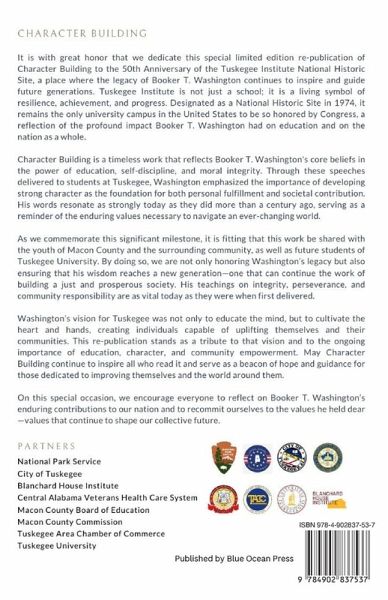 This is an abbreviated version of this introduction: It is with great honor that we dedicate this special limited edition republication of Character Building to the 50th anniversary of the Tuskegee Institute National Historic Site, a place where the legacy of Booker T. Washington continues to inspire and guide future generations. Tuskegee Institute is not just a school; it is a living symbol of resilience, achievement, and progress. Designated as a National Historic Site in 1974, it remains the only university campus in the United States to be so honored by Congress, a reflection of the profound impact Booker T. Washington had on education and on the nation as a whole.Character Building is a timeless work that reflects Booker T. Washington's core beliefs in the power of education, self-discipline, and moral integrity. Through these speeches delivered to students at Tuskegee, Washington emphasized the importance of developing strong character as the foundation for both personal fulfillment and societal contribution. His words resonate as strongly today as they did more than a century ago, serving as a reminder of the enduring values necessary to navigate an ever-changing world.As we commemorate this significant milestone, it is fitting that this work be shared with the youth of Macon County and the surrounding community, as well as future students of Tuskegee University. By doing so, we are not only honoring Washington's legacy but also ensuring that his wisdom reaches a new generation-one that can continue the work of building a just and prosperous society. His teachings on integrity, perseverance, and community responsibility are as vital today as they were when first delivered.National Park Service - City of TuskegeeBlanchard House InstituteCentral Alabama Veterans Healthcare SystemMacon County Board of EducationMacon County CommissionTuskegee Area Chamber of CommerceTuskegee University