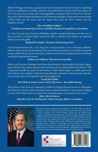 Robert Pittenger has been a good friend of our family for the last 50 years, beginning when he caddied for my father in the Pro-Am of the Byron Nelson Golf Tournament in 1971 when he was 22 years old! As thoughtfully conveyed in this book of very interesting stories, Rboert illustrates the personal character qualities of men and women he had worked with over the years and the impact they have for their country and the kingdom of God. Rev. Franklin Graham, President of Samaritan's Purse and Billy Graham Evangelistic Association As I have become close friends with Robert and his wonderful family over the years, I have watched a servant leader extend his life to enhance the mission of respected leaders across the globe. Michael W. Smith, Christian Performing Artist I have known Robert for a very long time and found him to be a devoted, authentic follower of his Savior. He has always been about sharing God's love and discovering the unique talents He has given each of us. Robert continues his faithful journey with these wonderful inspirational stories. Kathie Lee Gifford, Television Personality Robert and Suzane Pittenger have been close friends of our family for 40 years, beginning with the time I gave my personal testimony of my relationship with Christ to 5-- Congressional folks at a luau in their home in 1982! Robert offers a wealth of personal observations and insights in this book regarding the character traits of many individuals and why they lived impactful and meaningful lives. Coach Joe Gibbs, NFL Hall-of-Fame Coach; NASCAR owner - Joe Gibbs Racing The stories in this book are testament to Robet's fruitful life and service to illuminate the characters of some of the twentieth century's greatest leaders. I have been privileged to work with Robert and can attest to his vast experience and proven track record. Hon. Alicia Kearns, Member of U.K. Parliament; Chair, Foreign Affairs Committee