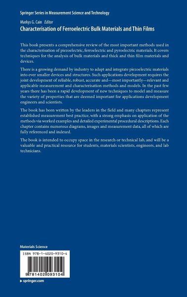 This book presents a comprehensive review of the most important methods used in the characterisation of piezoelectric, ferroelectric and pyroelectric materials. It covers techniques for the analysis of bulk materials and thick and thin film materials and devices.