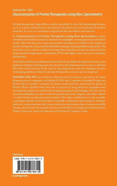 Characterization of Protein Therapeutics by Mass Spectrometry: Recent Developments and Future Directions.- The Use of Mass Spectrometry to Characterize the Metabolism of Peptide Therapeutics.- Quantitative Analysis of Biologics Using Mass Spectrometry.- Maximizing Structural Information from Whole Protein Tandem Mass Spectrometry.- Disulfide Linkages of an Albumin Fusion Protein.- Detailed Structural Characterization of Monoclonal Antibodies.- Application of Protein Mass Spectrometry in Impurity and Degradant Characterization.- Mass Spectrometry Methods to Analyze Higher Order Structure of Protein Therapeutics by Chemical Footprinting.- Aglycosylations Alters Protein Conformation in Antibodies Engineered with Specific Effector Functions Using HDX-MS.- Characterizing Biotherapeutic Protein 3D Structures by Electrospray Ion-Mobility Mass Spectrometry.- Oxford University, Characterization of Assemblies of Proteins by Mass Spectrometry.
