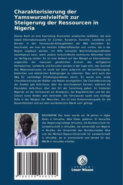 Dieses Buch ist eine Sammlung illustrierter praktischer Leitfäden, die eine ideale Informationsquelle für Züchter, Kuratoren, Forscher, Landwirte und Berater in den Yamswurzel-Anbaugebieten der Welt darstellen. Es beschreibt, wie man die meisten Süßkartoffelarten und -sorten, die in der Region angebaut werden, mit Hilfe manueller Beschreibungsmethoden identifizieren kann, wenn andere fortschrittliche technische Hilfsmittel nicht zur Verfügung stehen. Es ist eine Antwort auf den Mangel an Informationen angesichts der massiven genetischen Erosion des verfügbaren Keimplasmas. Landwirte und Forscher werden in der Lage sein, das Ausmaß des Materialverlustes im Laufe der Jahre aufgrund von Vernachlässigung, biotischen und abiotischen Bedingungen zu erkennen. Dies wird auch den Weg für nachhaltige Erhaltungspraktiken ebnen. Es wurde eine ariale Charakterisierung der Blätter und Reben durchgeführt. Die Charakterisierung der Knollen gab Aufschluss über die verschiedenen Formen, während die Passdaten Aufschluss über den Ort der Sammlung gaben. Im Südosten Nigerias ist die Yamswurzel als Brautpreis, bei Begräbnisriten und bei der Geburt eines Kindes weit verbreitet. Die Yamswurzel spielt eine wichtige Rolle in der Religion der Menschen. Sie ist eine Einkommensquelle für die Bauernfamilien und auf dem ausländischen Markt sehr gefragt.