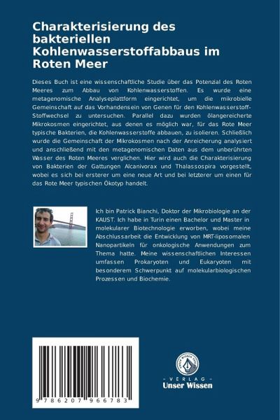 Dieses Buch ist eine wissenschaftliche Studie über das Potenzial des Roten Meeres zum Abbau von Kohlenwasserstoffen. Es wurde eine metagenomische Analyseplattform eingerichtet, um die mikrobielle Gemeinschaft auf das Vorhandensein von Genen für den Kohlenwasserstoff-Stoffwechsel zu untersuchen. Parallel dazu wurden ölangereicherte Mikrokosmen eingerichtet, aus denen es möglich war, für das Rote Meer typische Bakterien, die Kohlenwasserstoffe abbauen, zu isolieren. Schließlich wurde die Gemeinschaft der Mikrokosmen nach der Anreicherung analysiert und anschließend mit den metagenomischen Daten aus dem unberührten Wasser des Roten Meeres verglichen. Hier wird auch die Charakterisierung von Bakterien der Gattungen Alcanivorax und Thalassospira vorgestellt, wobei es sich bei ersterer um eine neue Art und bei letzterer um einen für das Rote Meer typischen Ökotyp handelt.
