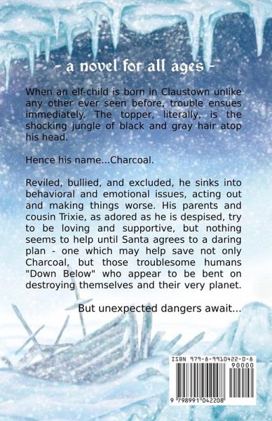 When an elf-child unlike any other ever seen in Claustown is born, trouble ensues immediately. The topper, literally, is the shocking jungle of black and gray hair atop his head. Hence his name: "Charcoal." Reviled, bullied and excluded for being different, he sinks into behavioral and emotional issues, acting out and making things worse. His parents and cousin Trixie, as adored as he is despised, try to be loving and supportive but nothing seems to help until Santa agrees to a daring plan, one which may help save Charcoal as well as those troublesome humans "Down Below" who seem determined to destroy themselves and the very planet they live on. But unexpected dangers await. Book One: UP TOP Is the first book in the Charcoal the Elf trilogy. Explore and revel in the coming of age of a troubled, but brilliant young adult as he learns to accept and respect himself while dealing with the scorn of his community.