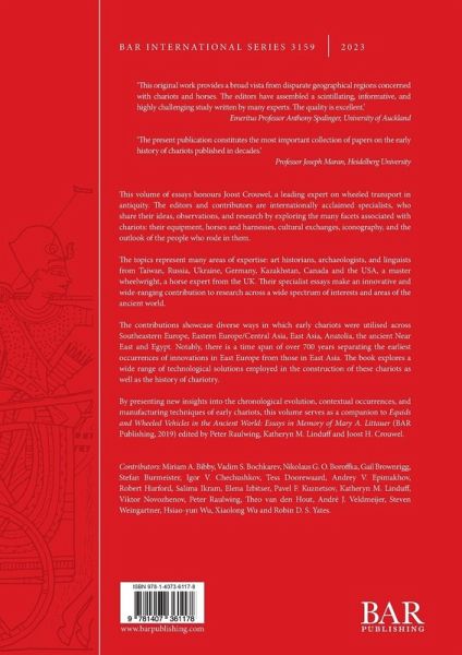 This volume of essays honours Joost Crouwel, a leading expert on wheeled transport in antiquity. The editors and contributors are internationally acclaimed specialists, who share their ideas, observations, and research by exploring the many facets associated with chariots: their equipment, horses and harnesses, cultural exchanges, iconography, and the outlook of the people who rode in them. The topics represent many areas of expertise: art historians, archaeologists, and linguists from Taiwan, Russia, Ukraine, Germany, Kazakhstan, Canada and the USA, a master wheelwright, a horse expert from the UK. Their specialist essays make an innovative and wide-ranging contribution to research across a wide spectrum of interests and areas of the ancient world. The contributions showcase diverse ways in which early chariots were utilised across Southeastern Europe, Eastern Europe/Central Asia, East Asia, Anatolia, the ancient Near East and Egypt. Notably, there is a time span of over 700 years separating the earliest occurrences of innovations in East Europe from those in East Asia. The book explores a wide range of technological solutions employed in the construction of these chariots as well as the history of chariotry. By presenting new insights into the chronological evolution, contextual occurrences, and manufacturing techniques of early chariots, this volume serves as a companion to Equids and Wheeled Vehicles in the Ancient World: Essays in Memory of Mary A. Littauer (BAR Publishing, 2019) edited by Peter Raulwing, Katheryn M. Linduff and Joost H. Crouwel.