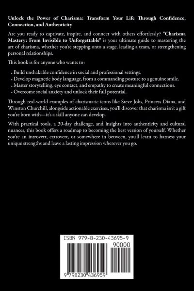 Unlock the Power of Charisma: Transform Your Life Through Confidence, Connection, and Authenticity Are you ready to captivate, inspire, and connect with others effortlessly? "Charisma Mastery: From Invisible to Unforgettable" is your ultimate guide to mastering the art of charisma, whether you're stepping onto a stage, leading a team, or strengthening personal relationships. This book is for anyone who wants to:Build unshakable confidence in social and professional settings. Develop magnetic body language, from a commanding posture to a genuine smile. Master storytelling, eye contact, and empathy to create meaningful connections. Overcome social anxiety and unlock their full potential. Through real-world examples of charismatic icons like Steve Jobs, Princess Diana, and Winston Churchill, alongside actionable exercises, you'll discover that charisma isn't a gift you're born with-it's a skill anyone can develop. With practical tools, a 30-day challenge, and insights into authenticity and cultural nuances, this book offers a roadmap to becoming the best version of yourself. Whether you're an introvert, extrovert, or somewhere in between, you'll learn to harness your unique strengths and leave a lasting impression wherever you go. Why Read This Book? Because charisma changes everything. It enhances your ability to lead, communicate, and connect. Don't just dream of being magnetic-take the steps to become it.