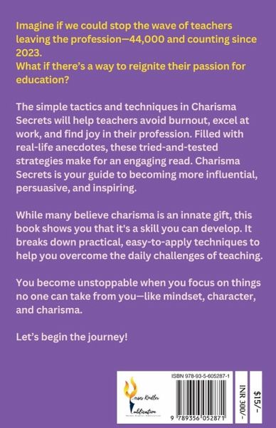 Imagine if we could stop the wave of teachers leaving the profession-44,000 and counting since 2023. What if there's a way to reignite their passion for education? The simple tactics and techniques in Charisma Secrets will help teachers avoid burnout, excel at work, and find joy in their profession. Filled with real-life anecdotes, these tried-and-tested strategies make for an engaging read. Charisma Secrets is your guide to becoming more influential, persuasive, and inspiring. While many believe charisma is an innate gift, this book shows you that it's a skill you can develop. It breaks down practical, easy-to-apply techniques to help you overcome the daily challenges of teaching. You become unstoppable when you focus on things no one can take from you-like mindset, character, and charisma. Let's begin the journey!