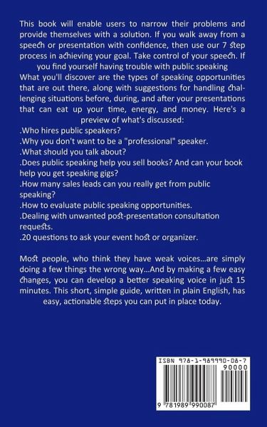 This book will enable users to narrow their problems and provide themselves with a solution. If you walk away from a speech or presentation with confidence, then use our 7 step process in achieving your goal. Take control of your speech. If you find yourself having trouble with public speaking What you'll discover are the types of speaking opportunities that are out there, along with suggestions for handling challenging situations before, during, and after your presentations that can eat up your time, energy, and money. Here's a preview of what's discussed: Who hires public speakers? Why you don't want to be a "professional" speaker. What should you talk about? Does public speaking help you sell books? And can your book help you get speaking gigs? How many sales leads can you really get from public speaking? How to evaluate public speaking opportunities. Dealing with unwanted post-presentation consultation requests. 20 questions to ask your event host or organizer. Most people, who think they have weak voices...are simply doing a few things the wrong way...And by making a few easy changes, you can develop a better speaking voice in just 15 minutes. This short, simple guide, written in plain English, has easy, actionable steps you can put in place today.