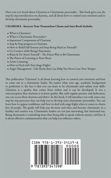 Have you ever heard about Charisma or Charismatic personality - This book gives you the step by step introduction on charisma, and all about how to control your emotions and to develop charismatic personality CHARISMA - Increase Your Tremendous Charm and Aura Book IncludesWhat is Charisma? What is Charismatic Personality? Important Components of Charisma Step by Step progress to Charisma How to Build Self-Esteem and Stop Being Hard on Yourself? Go Creative while Being Charismatic Relax & De-Stress Yourself - The Finest Way to Be Charismatic The Power of Listening to Your Heart Active Listening How to Deal with Your Stage Fright? Anger Management - Life Hacks that Can Help You Never Lose Your Temper This publication "Charisma" is all about learning how to control your emotions and how to come out as a charismatic leader. No matter what your age, academic background or profession is, the fact is that you can learn to be charismatic and radiate your skills. Charisma is a quality that comes from within and it can be developed. It was a misconception that charisma is in-born quality. But with regular practice and dedication, one can access their charisma and thrive. In this book, I will introduce you with some easy, step-by-step processes that can help you to develop your charismatic personality. You can learn how to appear confidence and how to deal with stage fright when it comes to charm lots of people. The guide will help you de-stress and relax and become charismatic in a healthy and creative way. Charismatic leaders are not just interesting, but interested too. Being charismatic is something more than being able to speak without anxiety and fear. It is about effective communication that can help you influence others.