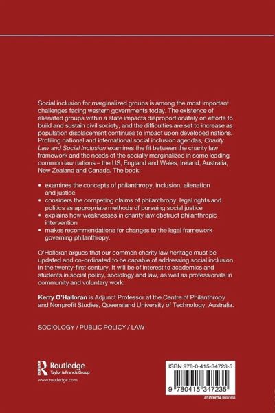Profiling national and international social inclusion agendas, Charity Law and Social Inclusion examines the fit between the charity law framework and the needs of the socially marginalized in some leading common law nations: the US, England and Wales, Ireland, Australia, New Zealand and Canada. It: examines the concepts of philanthropy, inclusion, alienation and justice considers the competing claims of philanthropy, legal rights and politics as appropriate methods of pursuing social justice explains how weaknesses in charity law obstructs philanthropic intervention makes recommendations for changes to the legal framework governing philanthropy. O'Halloran argues that our common charity law heritage must be updated and co-ordinated to be capable of addressing social inclusion in the twenty-first century. This book is of interest to academics and students working and sudying in the areas of social policy, sociology and law, as well as professionals in community and voluntary work.