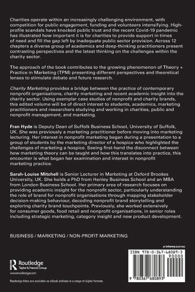Charity Marketing provides a bridge between the practice of contemporary nonprofit organisations, charity marketing and recent academic insight into the charity sector. Using exemplar case studies of nonprofit and charitybrands, this edited volume will be of direct interest to students, academics, marketing practitioners and researchers studying and working in charities, public and nonprofit management, and marketing.