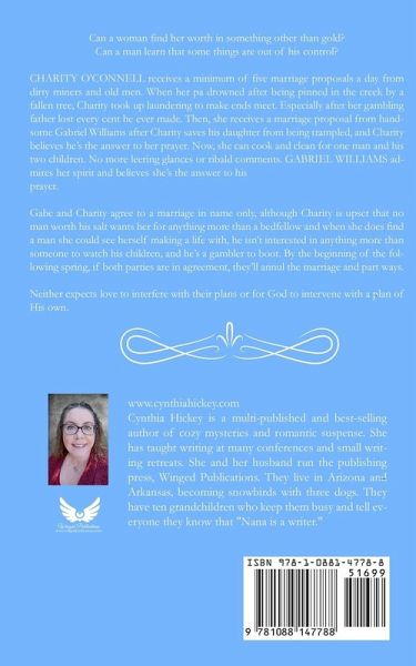 Can a woman find her worth in something other than gold? Can a man learn that some things are out of his control? CHARITY O'CONNELL receives a minimum of five marriage proposals a day from dirty miners and old men. When her pa drowned after being pinned in the creek by a fallen tree, Charity took up laundering to make ends meet. Especially after her gambling father lost every cent he ever made. Then, she receives a marriage proposal from handsome Gabriel Williams after Charity saves his daughter from being trampled, and Charity believes he's the answer to her prayer. Now, she can cook and clean for one man and his two children. No more leering glances or ribald comments. GABRIEL WILLIAMS admires her spirit and believes she's the answer to his prayer. Gabe and Charity agree to a marriage in name only, although Charity is upset that no man worth his salt wants her for anything more than a bedfellow and when she does find a man she could see herself making a life with, he isn't interested in anything more than someone to watch his children, and he's a gambler to boot. By the beginning of the following spring, if both parties are in agreement, they'll annul the marriage and part ways. Neither expects love to interfere with their plans or for God to intervene with a plan of His own.