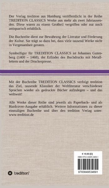 Diese Hardcover-Ausgabe ist Teil der TREDITION CLASSICS. Der Verlag tredition aus Hamburg veröffentlicht in der Buchreihe TREDITION CLASSICS Werke aus mehr als zwei Jahrtausenden. Diese waren zu einem Großteil vergriffen oder nur noch antiquarisch erhältlich. Mit TREDITION CLASSICS verfolgt tredition das Ziel, tausende Klassiker der Weltliteratur verschiedener Sprachen wieder als gedruckte Bücher zu verlegen und das weltweit! Die Buchreihe dient zur Bewahrung der Literatur und Förderung der Kultur. Sie trägt so dazu bei, dass viele tausend Werke nicht in Vergessenheit geraten.
