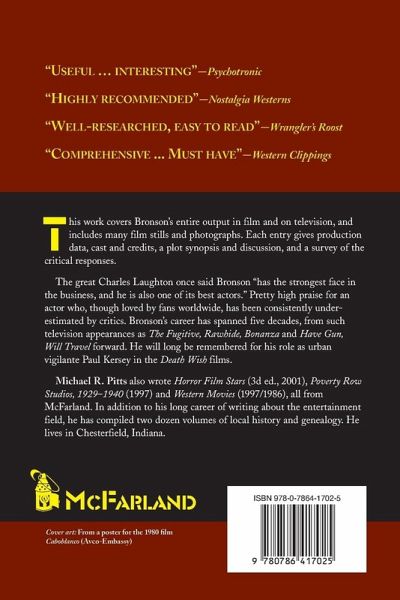 This work covers Bronson's entire output in film and on television, and includes many film stills and photographs. Alphabetical entries list film or episode, complete cast and credits, and year of release. Accompanying each entry's plot synopsis and discussion is a survey of the critical responses to the work. The great Charles Laughton once said Bronson "has the strongest face in the business, and he is also one of its best actors." Pretty high praise for an actor who, though loved by fans worldwide, has been consistently underestimated by critics. Bronson's career has spanned five decades, from such television appearances in The Fugitive, Rawhide, Bonanza and Have Gun, Will Travel as well as the telemovie A Family of Cops (1995) and its two sequels. He will long be remembered for his role as urban vigilante Paul Kersey in the Death Wish films. Bronson is one of the most enigmatic, and also most recognizable, of all film stars.