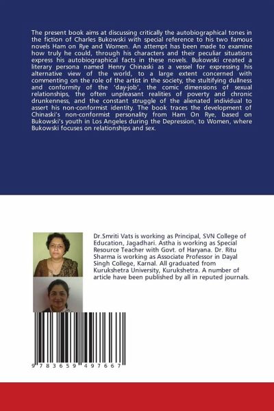 The present book aims at discussing critically the autobiographical tones in the fiction of Charles Bukowski with special reference to his two famous novels Ham on Rye and Women. An attempt has been made to examine how truly he could, through his characters and their peculiar situations express his autobiographical facts in these novels. Bukowski created a literary persona named Henry Chinaski as a vessel for expressing his alternative view of the world, to a large extent concerned with commenting on the role of the artist in the society, the stultifying dullness and conformity of the day-job , the comic dimensions of sexual relationships, the often unpleasant realities of poverty and chronic drunkenness, and the constant struggle of the alienated individual to assert his non-conformist identity. The book traces the development of Chinaski s non-conformist personality from Ham On Rye, based on Bukowski s youth in Los Angeles during the Depression, to Women, where Bukowski focuseson relationships and sex.