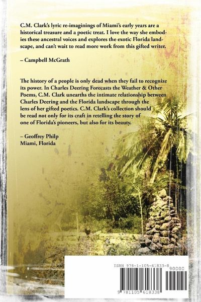 C.M. Clark's work has appeared throughout the U.S., in Canada, and internationally. Publication credits include Painted Bride Quarterly, West Trade Review, Wild Roof Journal, Bookends Review, Prime Number Magazine, Vallum Magazine (Montreal), Punt Volat (Barcelona), The Paddock Review, Pegasus, Ovenbird, and the South Florida Poetry Journal. Her work has been anthologized in collections including Anhinga Press's Rumors, Secrets and Lies, Demeter Press's Travellin' Mama, in Voices from the Fierce Intangible World (South Florida Poetry Journal Annual), and in Chasing Light (Yellow Jacket Press). Clark was a finalist for the Anhinga Press 2021 Chapbook Prize, and runner-up for the Slate Roof Press Elyse Wolf Prize. Clark is the author of full-length works Exoskeletal (Solution Hole Press, 2019), Dragonfly (Solution Hole Press, 2016), Charles Deering Forecasts the Weather & Other Poems (Solution Hole Press, 2012), The Blue Hour (Three Stars Press, 2007), Pillow Talk, a collaboration with painter Georges LeBar (Porky Pie Press, 2007), as well as the chapbook, The Five Snouts, (Finishing Line Press, 2017).