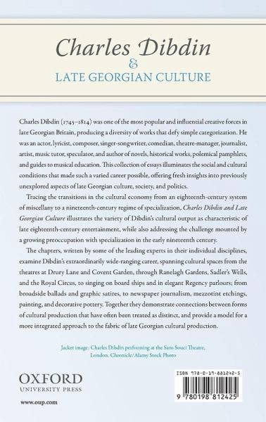 Charles Dibdin (1745-1814) was one of the most popular and influential creative forces in late Georgian Britain, producing a diversity of works that defy simple categorisation. He was an actor, lyricist, composer, singer-songwriter, comedian, theatre-manager, journalist, artist, music tutor, speculator, and author of novels, historical works, polemical pamphlets, and guides to musical education. This collection of essays illuminates the social and cultural conditions that made such a varied career possible, offering fresh insights into previously unexplored aspects of late Georgian culture, society, and politics. Tracing the transitions in the cultural economy from an eighteenth-century system of miscellany to a nineteenth-century regime of specialisation, Charles Dibdin and Late Georgian Culture illustrates the variety of Dibdin's cultural output as characteristic of late eighteenth-century entertainment, while also addressing the challenge mounted by a growing preoccupation with specialisation in the early nineteenth century. The chapters, written by some of the leading experts in their individual disciplines, examine Dibdin's extraordinarily wide-ranging career, spanning cultural spaces from the theatres at Drury Lane and Covent Garden, through Ranelagh Gardens, Sadler's Wells, and the Royal Circus, to singing on board ships and in elegant Regency parlours; from broadside ballads and graphic satires, to newspaper journalism, mezzotint etchings, painting, and decorative pottery. Together they demonstrate connections between forms of cultural production that have often been treated as distinct, and provide a model for a more integrated approach to the fabric of late Georgian cultural production.
