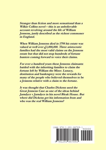 Stranger than fiction and more sensational than a Wilkie Collins novel - this is an unbelievable account revolving around the life of William Jennens, justly described as the richest commoner in England. When William Jennens died in 1798 his estate was valued at well over £1,000,000. Three aristocratic families had the most valid claims on the Jennens estate but that did not stop hundreds of fortune hunters coming forward to voice their claims. For over a hundred years these Jennens claimants battled with the inheriting families to claim the fortune left by William the Miser. Lunacy, destitution and bankruptcy were the rewards for many of the people who believed themselves to be a Jennens relative with a claim to the fortune. It was thought that Charles Dickens used the Great Jennens Case as one of the ideas behind Jarndyce v Jarndyce in his novel Bleak House. But where did Dickens get his information from and who was the real William Jennens?