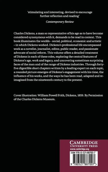 Charles Dickens, a man so representative of his age as to have become considered synonymous with it, demands to be read in context. This book illuminates the worlds - social, political, economic and artistic - in which Dickens worked. Dickens's professional life encompassed work as a novelist, journalist, editor, public reader and passionate advocate of social reform. This volume offers a detailed treatment of Dickens in each of these roles, exploring the central features of Dickens's age, work and legacy, and uncovering sometimes surprising faces of the man and of the range of Dickens industries. Through 45 digestible short chapters written by a leading expert on each topic, a rounded picture emerges of Dickens's engagement with his time, the influence of his works and the ways he has been read, adapted and re-imagined from the nineteenth century to the present.