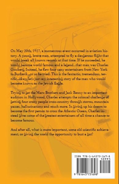 On May 20th, 1927, a momentous event occurred in aviation history. A young, brave man, attempted to fly a dangerous flight that would break all known records at that time. If he succeeded, he would become world famous and a legend…that man was Charles Ginsberg. Instead, he flew four zany entertainers from New York to Burbank…or so he tried. This is the fantastic, tremendous, terrific…okay, let’s just say, interesting story of the man who would become known as the "Jewish Eagle". Trying to get the Marx Brothers and Jack Benny to an important audition in Hollywood, Charles attempts the colossal challenge of getting four crazy people cross-country through storms, mountain passes, hallucinations and much more. In giving up his dream to become the first person to cross the Atlantic Ocean, Charles instead gives some of the greatest entertainers of all time a chance to become famous. And after all, what is more important, some major personal achievement, or giving the world the opportunity to bust a gut?