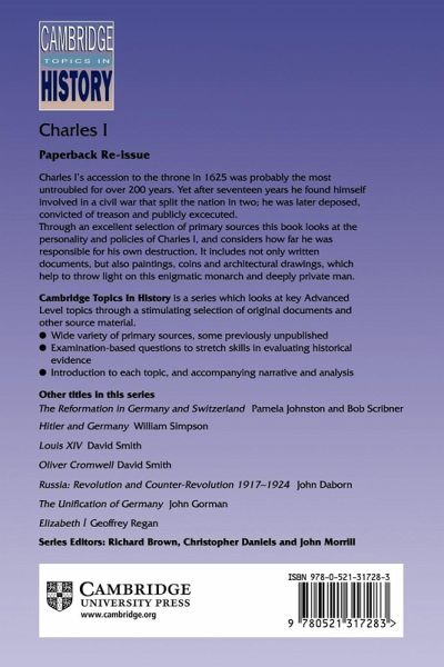 Charles I's accession to the throne in 1625 was probably the most untroubled for over 200 years. Yet after seventeen years he found himself involved in a civil war that split the nation in two; he was later deposed, convicted of treason and publicly executed. Through an excellent selection of primary sources this book looks at the personality and policies of Charles I, and considers how far he was responsible for his own destruction. It includes not only written documents, but also paintings, coins and architectural drawings, which help to throw light on this enigmatic monarch and deeply private man. This successful volume in the Cambridge Topics in History series is reprinted with a full colour cover.