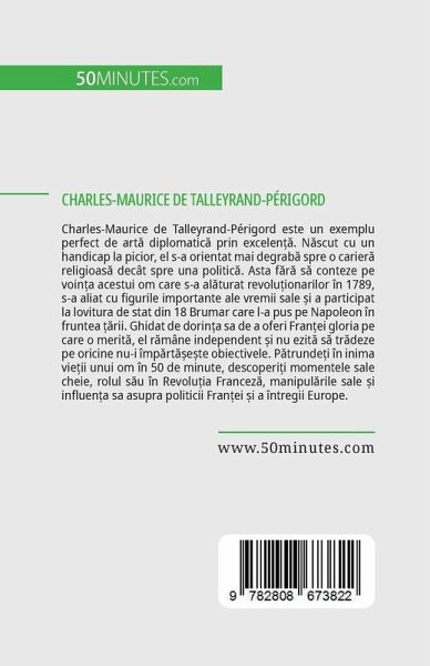 Charles-Maurice de Talleyrand-Périgord este un exemplu perfect de art¿ diplomatic¿ prin excelen¿¿. N¿scut cu un handicap la picior, el s-a orientat mai degrab¿ spre o carier¿ religioas¿ decât spre una politic¿. Asta f¿r¿ s¿ conteze pe voin¿a acestui om care s-a al¿turat revolüionarilor în 1789, s-a aliat cu figurile importante ale vremii sale ¿i a participat la lovitura de stat din 18 Brumar care l-a pus pe Napoleon în fruntea ¿¿rii. Ghidat de dorin¿a sa de a oferi Fran¿ei gloria pe care o merit¿, el r¿mâne independent ¿i nu ezit¿ s¿ tr¿deze pe oricine nu-i împ¿rt¿¿e¿te obiectivele. P¿trunde¿i în inima vie¿ii unui om în 50 de minute, descoperi¿i momentele sale cheie, rolul s¿u în Revolüia Francez¿, manipul¿rile sale ¿i influen¿a sa asupra politicii Fran¿ei ¿i a întregii Europe.