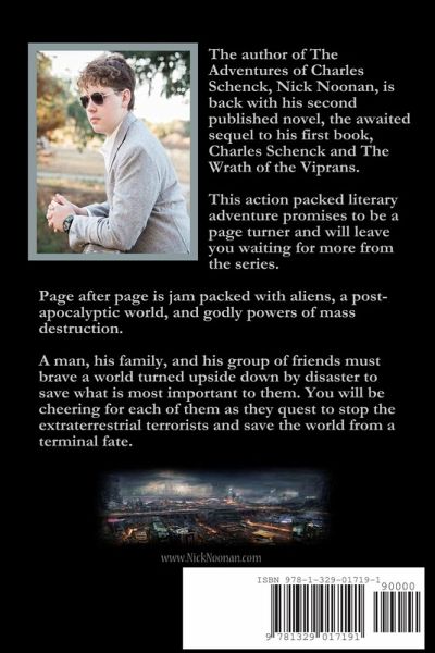 The author of The Adventures of Charles Schenck, Nick Noonan, is back with his second published novel, the awaited sequel to his first book, Charles Schenck and The Wrath of the Viprans. This action packed literary adventure promises to be a page turner and will leave you waiting for more from the series. Page after page is jam packed with aliens, a post-apocalyptic world, and godly powers of mass destruction. A man, his family, and his group of friends must brave a world turned upside down by disaster to save what is most important to them. You will be cheering for each of them as they quest to stop the extraterrestrial terrorists and save the world from a terminal fate at any cost.
