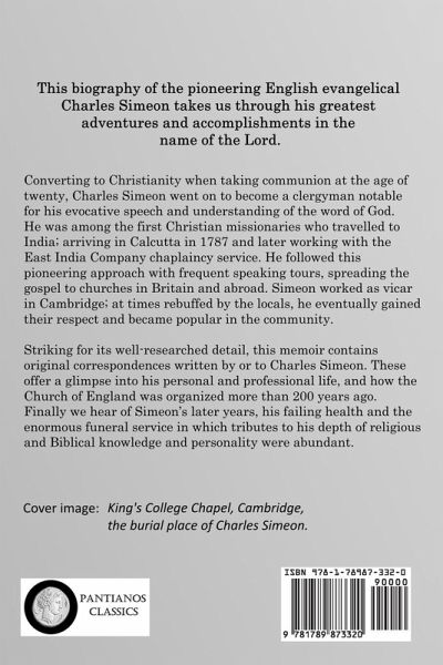This biography of the pioneering English evangelical Charles Simeon takes us through his greatest adventures and accomplishments in the name of the Lord. Converting to Christianity when taking communion at the age of twenty, Charles Simeon went on to become a clergyman notable for his evocative speech and understanding of the word of God. He was among the first Christian missionaries who travelled to India; arriving in Calcutta in 1787 and later working with the East India Company chaplaincy service. He followed this pioneering approach with frequent speaking tours, spreading the gospel to churches in Britain and abroad. Simeon worked as vicar in Cambridge; at times rebuffed by the locals, he eventually gained their respect and became popular in the community. Striking for its well-researched detail, this memoir contains original correspondences written by or to Charles Simeon. These offer a glimpse into his personal and professional life, and how the Church of England was organized more than 200 years ago. Finally we hear of Simeon's later years, his failing health and the enormous funeral service in which tributes to his depth of religious and Biblical knowledge and personality were abundant.